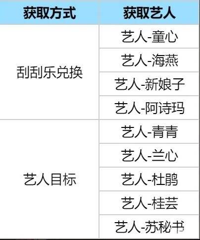 游戏中艺人主要通过刮刮卡兑换和艺人目标获取!