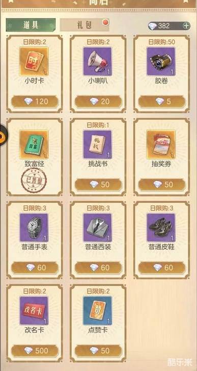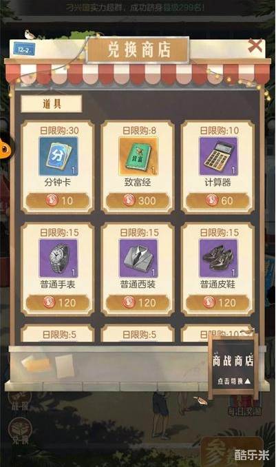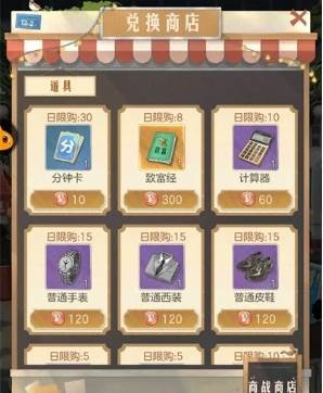 6、商店购买:在前期优先购买魅力道具、经验卡、人参、普通西装、普通皮鞋、普通手表,其余道具可根据自身情况进行购买。
