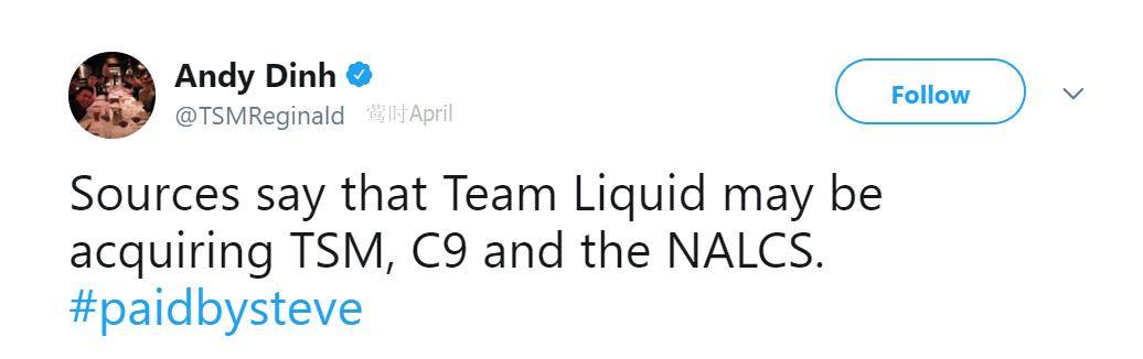 “据来源称,Team Liquid将会获得TSM、C9以及整个北美英雄联盟联赛。”