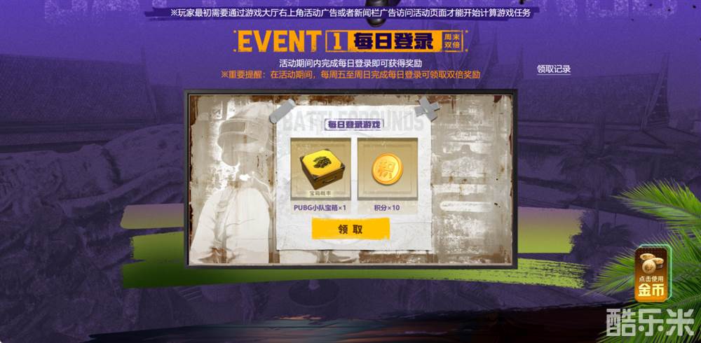 每日坚持登录游戏,即可领取基础奖励:一个PUBG小队宝箱和10积分,周末登陆奖励翻倍!为你的寻梦之路增添助力。