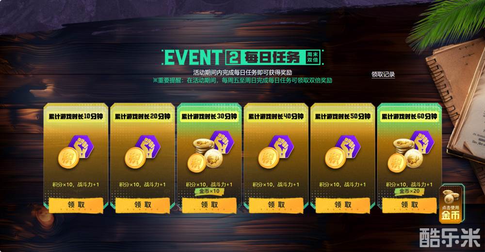 完成一系列的日常任务,不仅能提升你的游戏技巧,还能获得丰厚的奖励。累计游戏时长10分钟即可获得10积分和战斗力+1,继续游戏每过10分钟还会增加奖励,每日最多可以累积60分钟!