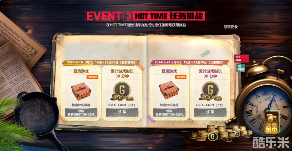 特别的日子,特别的挑战。8月10日和8月24日,在这两天活动日中,HOT TIME活动等你来战,成功完成挑战即可获得限量版奖励,登录就能获得惊喜快乐宝箱,这两天分别累计游戏时长30分钟,还有300/600 G-Coin(7天)奖励拿!