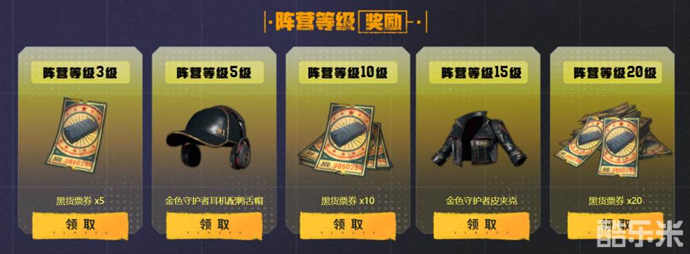 随着阵营等级的提升,在3/5/10/15/20级时能够获得黑货票券*5/金色守护者耳机配鸭舌帽/黑货票券 x10/金色守护者皮夹克/黑货票券 x20,等级不同奖励不同,努力升级阵营等级,获取全新皮肤彰显你的独特魅力!