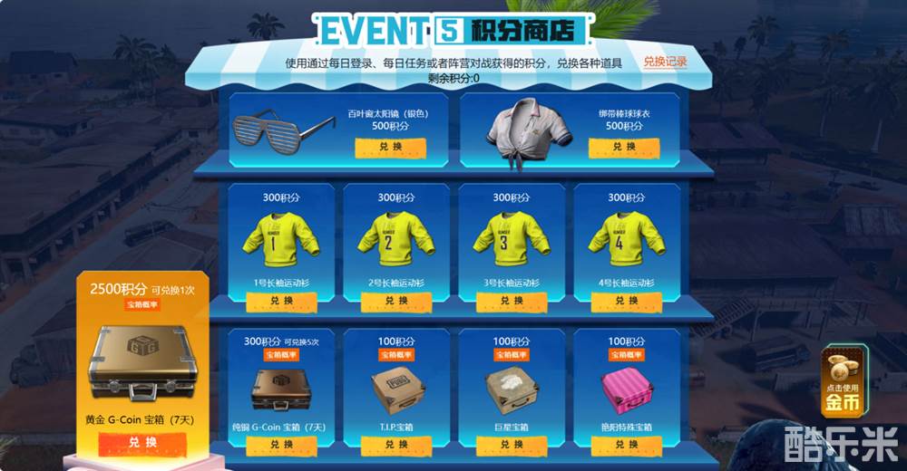 通过完成任务和挑战累积的积分,可以在积分商店中兑换心仪的物品。100积分可兑换各种普通宝箱,300积分可兑换不同编号的长袖运动衫,500积分可兑换绑带棒球球衣和百叶窗太阳镜(银色),2500积分则是黄金G-Coin宝箱(7天)。福利多多,精彩多多。