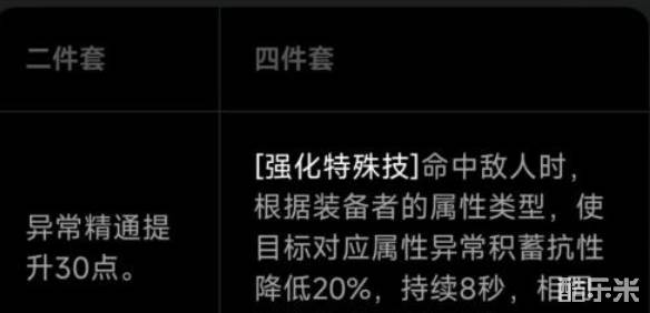 四件套:强化特殊技命中敌人时,根据装备者的属性类型,使目标对应属性异常积蓄抗性降低20%,持续8秒,相同属性的效果不可叠加。