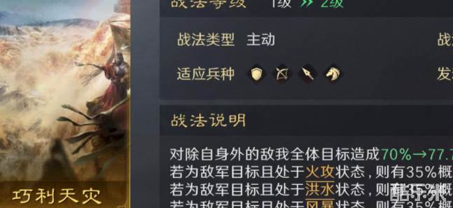 天灾配置的核心在于【巧利天灾】这一橙色品质战法。该战法作为主动谋略型战法,其发动概率和效果在S2赛季中虽可能有所调整,但基础机制并未发生根本性变化。因此,只要玩家能够合理搭配队伍和战法,天灾配置依然能够展现出强大的战斗力。