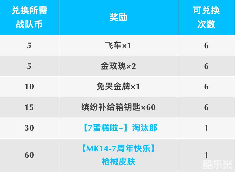 在本次活动中,肠肠共可获得飞车×6、金玫瑰×12、免哭金牌×6、缤纷补给箱钥匙×360、【7蛋糕啦~】淘汰郎、【MK14-7周年快乐】枪械皮肤