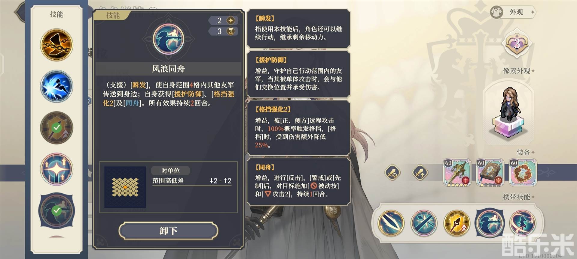 风浪同舟作为学姐独有传送技能,能够将4格范围内的其他友军传送到身边,自身获得援护及额外的强化效果,同舟的效果可以在先制、警戒前降低目标攻击和封印被动技能两回合,所以学姐实战不会特别容易死亡,不过真要抗也抗不住多久