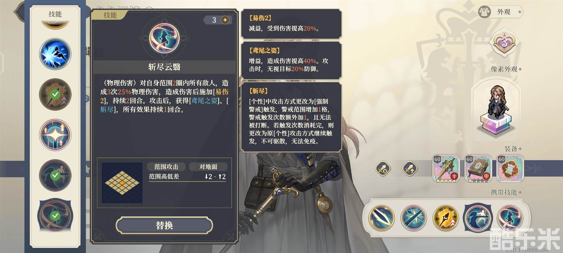 斩尽云翳是学姐核心输出手段,对两圈内的敌人造成伤害并施加易伤2,攻击后自身获得两个独有的buff,鸢尾之姿提升40%伤害、无视20%防御,个性每回合结束都有,一般情况不用担心被驱散的问题;斩尽将个性变为强制警戒,警戒范围增加一格,增加额外触发次数且警戒不可打断,对于输出的提升很大,伤害触发也会带有专属普攻效果