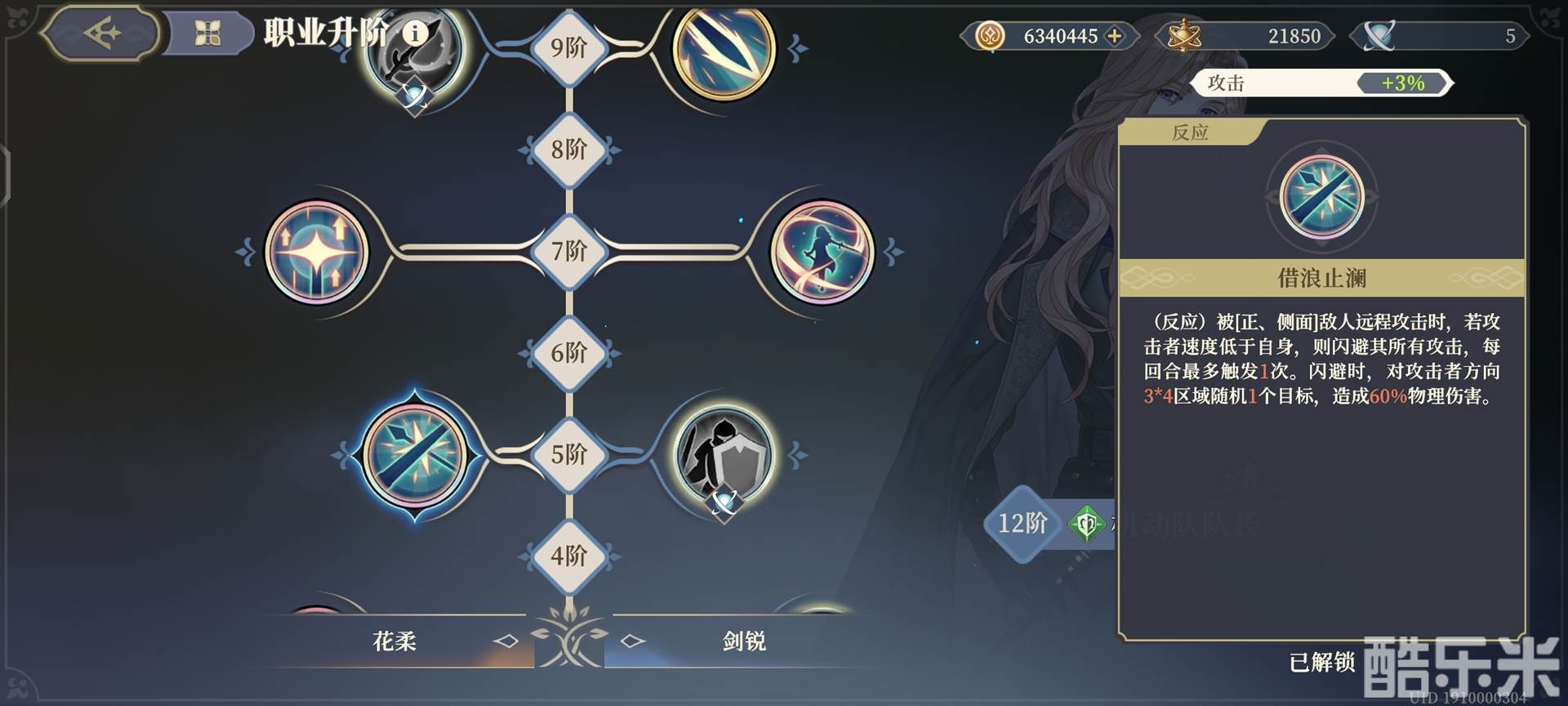 借浪止澜是专属反应技,每回合能够抵消一轮远程攻击,限制速度必须低于莉拉当前速度,闪避后,会对目标3*4范围随机一个单位造成一次伤害,实战效果不错,保命和辅助输出都有