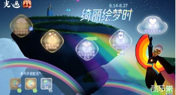 《sky光遇》多彩汇云间现已开启,玩家只需完成指定任务就能获得绚丽彩、璀璨之星、爱心以及彩虹尾迹等奖励,下面酷乐米小编将为大家带来详细的玩法介绍,感兴趣的小伙伴一起来看看吧。