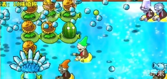 3、当下方的僵尸快靠近小推车时,种植一个寒冰豌豆菇。