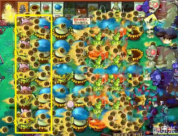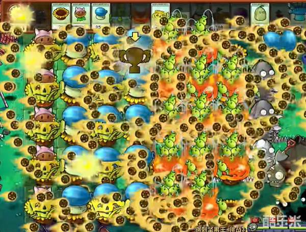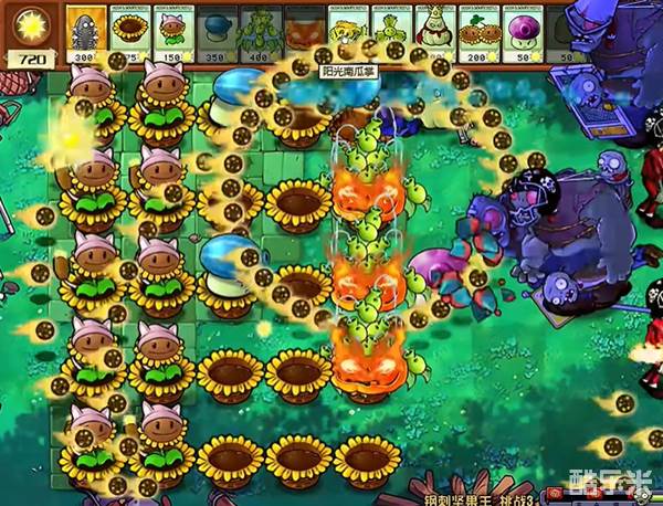 3、输出植物要不断去种植,同时也要为植物套上南瓜,有难处理的僵尸就用反制类植物。