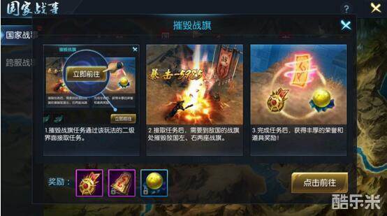 摧毁战旗属于国家战事中的日常任务,每日10点到24点开放。侠客们在接取任务后需要到敌国主城门附近找到左、右两座战旗并摧毁,方可完成任务。不过由于前往敌国地盘,分分钟会被敌人发现并引起一场激战,所以风险极大。各位侠客可与家族成员或好友一起组队前往,在一定范围内同国玩家都可以完成任务。