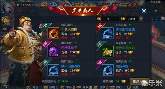 与其他贪婪的商人不同,在黑市商人处你往往可以用一个较低的价格拿下市面上珍稀的宝物。黑市商人贩卖物品的原则是一切随心,因此能买到怎样的宝物,能打多少折扣,都取决了各位的运气了。如果对当前的商品不满意,玩家也可消耗绑定元宝来贿赂黑市商人进行刷新,若实在是囊中羞涩,也可等待一段时间后的系统自动刷新。