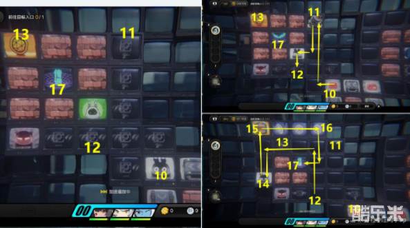 4、先去11区按R键放一个炸弹,走到12区引爆炸弹炸开左边的墙壁,依次去13-16区拿奖励,最后去17区传送;