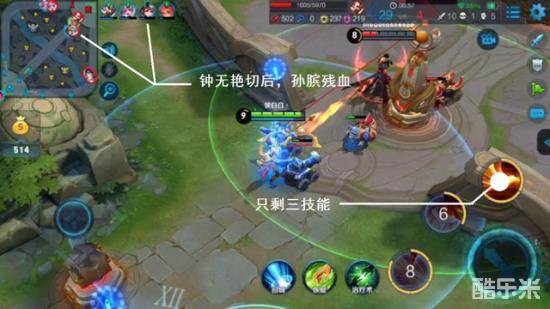 小地图在对战中有着非常重要的作用,adc追击敌方英雄或者带兵偷塔时,切忌急功近利,随时在小地图注意敌方其他英雄的踪迹,尤其是绕后的刺客。在本局对战中,小白两个技能已将敌方曹操打至残血,这时钟无艳从后方出现,我方孙膑已是残血状态,若小白继续越塔强杀将三技能放出,并不能将曹操杀死,友方孙膑还很可能会牺牲,那就将技能留着跟孙膑一起将钟无艳收割掉。