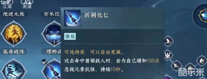 折荆化匕是属于可选特制之一,能够自由更换,在攻击命中首领敌人时,为自身增加180点忽视元素抗性的效果,持续10秒钟。应该说这是一个比较普遍的特质,各个职业都可以融入进去,因为忽视元素抗性对于每个职业提高输出都是有帮助的,是否要使用还要根据自身目前的流派来定。