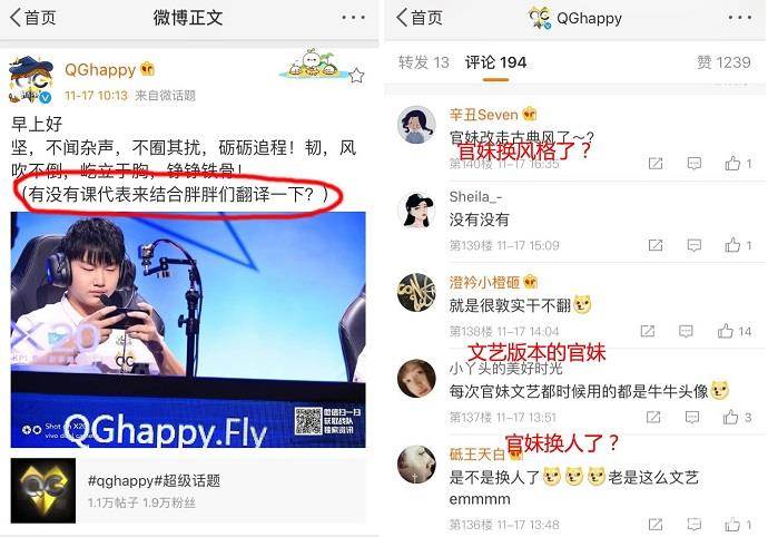 每天刷刷微博,看看自己喜欢的战队和队员们的动向,想必是很多王者峡谷召唤师的日常,一向以诙谐幽默为主的QGhappy博娘最近突然很文艺,尤其是11月17的上午的微博。