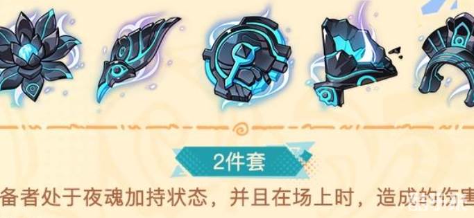 装备者触发其对应元素类型的相关反应后,队伍中附近的所有角色的该元素反应相关的元素伤害加成提升12%,持续15秒。若触发该效果时,装备者处于夜魂加持状态下,还将使队伍中附近的所有角色的与该元素反应相关的元素伤害加成提升28%,持续20秒。装备者处于后台时也能触发上述效果。同名圣遗物套装产生的伤害加成效果无法叠加。