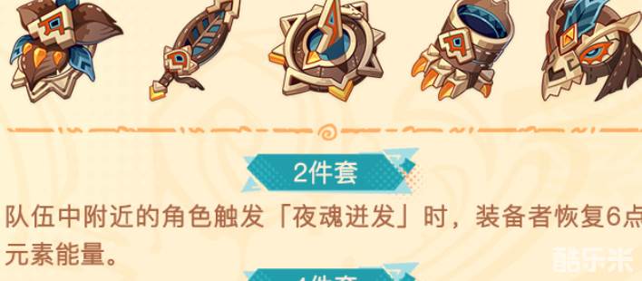 队伍中附近的角色触发「夜魂进发」时,装备者恢复6点元素能量。