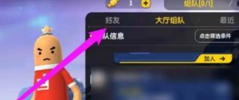 1、首先进入游戏界面,在游戏大厅的右上角位置,点击组队选项。