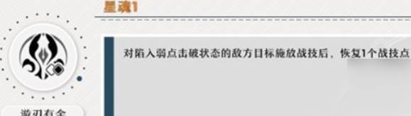 1命核心星魂,对弱点击破状态下的敌人释放战技,则会恢复1点战技点,大大缓解了战技点的压力。「素裳」对战技点需求还是非常大的,一是「素裳」几乎每回合都使用战技,其次就是终结技的再动「素裳」战技→「素裳」终结技→「素裳」战技,也使「素裳」直接消耗两个战技点。