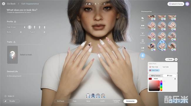 玩家可以通过《inZOI: Character Studio》,自定义装扮角色“Zoi”。游戏内提供了 250 多种自定义选项,玩家可以自由设计发型、衬衫袖长、指甲、年龄、身高以及体型等。此外,还可以通过AI工具为角色服饰创造无限样式。