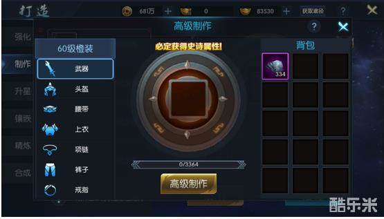 在高级制作中,玩家可以任意选择制定部位进行打造,且打造出的装备必定为史诗属性!首先玩家需要消耗装备碎片、制作图纸来提供锻造值,当锻造值满后即可打造装备。
