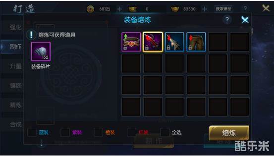 若对打造出的装备不是特别满意,玩家也可以将其熔炼来进行部分材料的回收。装备品质越高等级越高,熔炼所获得的装备碎片越多,且仅有熔炼紫色品质以上的装备才会产出制作图纸碎片。