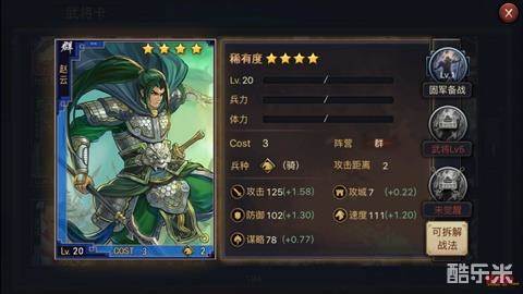 四星群赵云基本是当前锋的不二人选,自身属性在四星武将里算是成长很高的了,主技能减伤60%。。带上回马,站在前面基本就是个带刺的钢板,第3个技能的选择有很多,其实不管是输出类的还是恢复类或者免伤类(如规避)的都行。