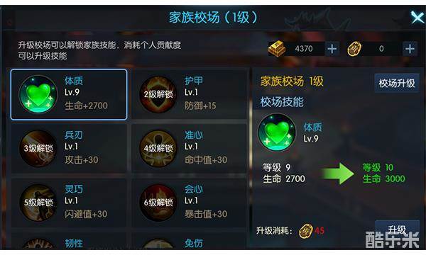 升级家族校场可以解锁家族技能,玩家可以通过消耗家族个人贡献度升级家族技能。