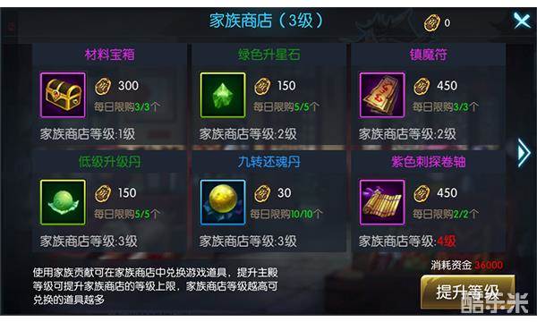 使用家族个人贡献可以在家族商店兑换各种道具,提升家族商店等级可以解锁更多的道具兑换。