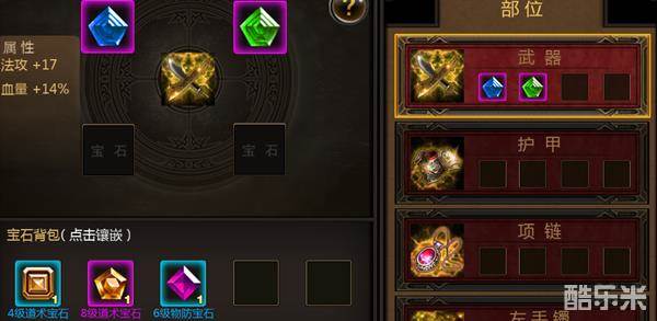 7个装备部位都可以镶嵌宝石,每个装备部位最多可以镶嵌4颗宝石,每个部位同类型的宝石只能镶嵌1颗,也就是说最多可以镶嵌28颗宝石。