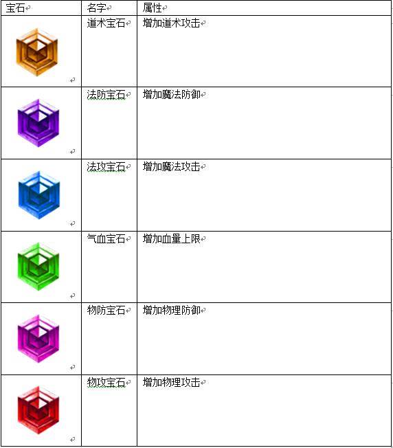 宝石分6种类型:道术、法防、法攻、气血、物防、物攻。宝石有10个等级,低级宝石可以合成高级宝石,等级越高,属性越高。