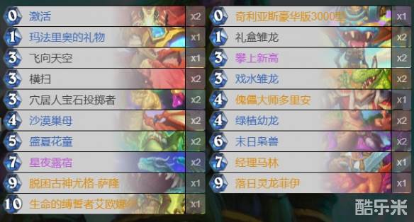 前期跳费后在中期即可依靠多里安加盛夏花童的经典combo开始压制对手,奇利亚斯也舍弃了病毒完美的防守组合,反而携带复制完美的更强进攻节奏,若前期的跳费节奏不顺导致中期的场面难以压死对手,那就依靠马林的宝藏打后期,由于马林德过牌极快,故托林的酒杯是有较大概率抽到好东西的,大家可以开个记牌器,或者自己算一下牌库中的牌后考虑开酒杯。