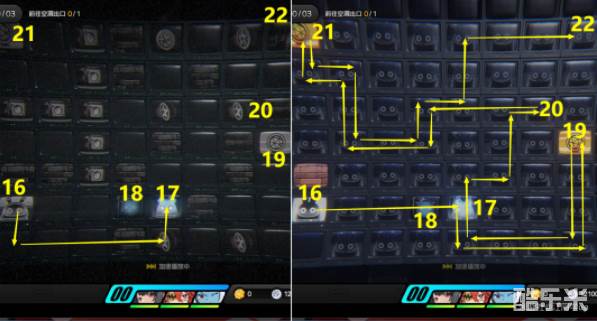 7、先打开【红外摄像头】,去打17区的怪,打开18区的门后,再关闭【红外摄像头】,然后再去18-17-19区,接着依次去17-20-21-22区,接着弹到右边23区;
