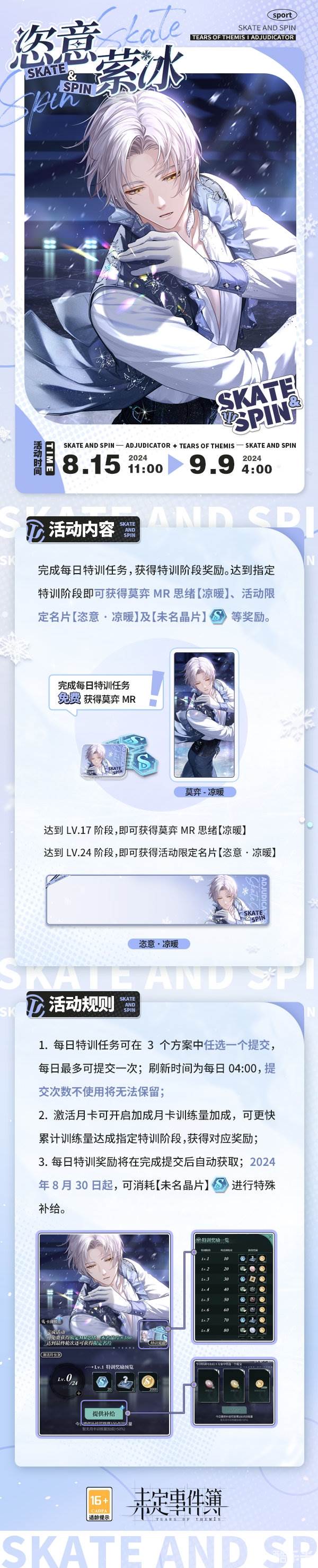 活动期间,律师可通过选择不同的「提供补给」方案完成每日特训任务,获得特训阶段奖励。达到指定特训阶段即可获得莫弈MR思绪【凉暖】、活动限定名片【恣意 · 凉暖】及【未名晶片】等奖励