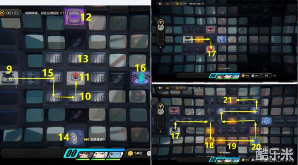 3、接着先去 10 区域,将 11 区域的开关向上推动一下后即可前往 12 区域。接着去 13 区域,将 11 区域的开关向下推动一下后即可前往 14 区域。然后再去 15 区域,将 11 区域的开关向右推动一下后即可前往 16 区域传送。接着前往 17 区域,接着依次前往 18、19、20、21 区域,遇到墙壁直接撞开即可。