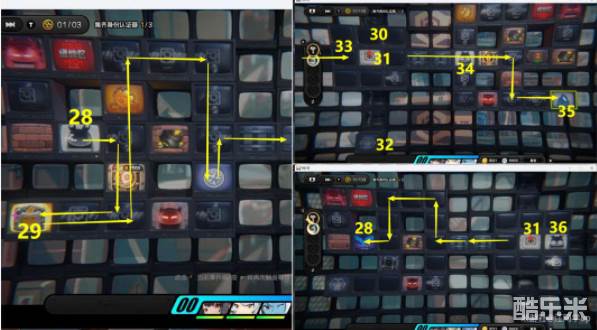 5、接着去拿取 29 宝箱。接着前往右边的 30 区域,将 31 区域的开关向下推动一下后即可去拿取 32 区域宝箱。然后再去 33 区域,将 31 区域的开关向右推动一下后即可前往 34 区域。接着撞开 34 区域右边的墙壁后前往 35 区域。最后再返回左边的 36 区域,将 31 区域的开关向左推动一下后,前往左边的 28 区域传送。