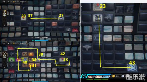 6、接着前往 37 区域,将 23 区域的开关向左推动一下后即可前往 38 区域。接着撞开 39 区域后前往 40 和 41 区域。然后再去 42 区域,将 23 区域的开关向下推动一下后即可前往下面的 43 区域。