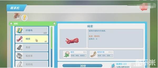2、制作绳索:将棉花带回家园,使用鞣革机将其转化为绳索。