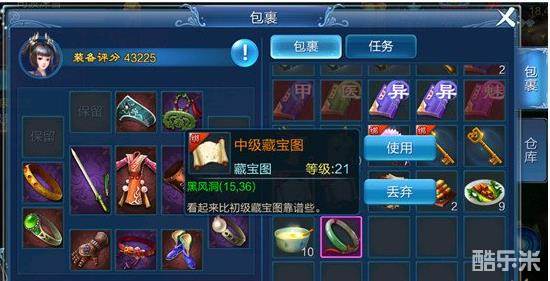 3.获得藏宝图后,只要在道具栏里使用藏宝图,便可以自动寻路至挖宝地点,再次使用藏宝图,便可以获得成功挖宝。