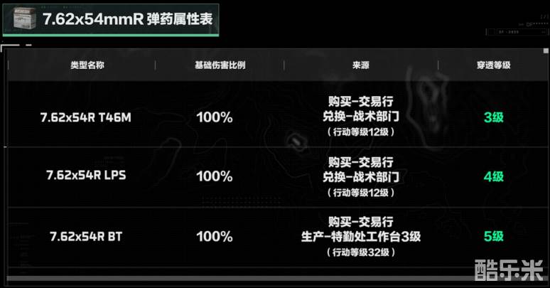 其中最基础的7.62x54R T46M是3级弹药,可在交易行中购买,或者行动等级达到12级之后在战术部门兑换。
