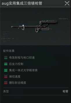 核心配件枪管,我们可以在前期解锁【AUG实用集成三倍镜枪管】,它除了提供常规枪管的后坐力加成和不错的射程加成以外,还会提供一个三倍镜让你前期就能享受到远距离架枪的乐趣。另外枪管的精校我推荐选择增加枪口初速。既然大远距离的,那么消音器必不可少这里推荐主打架枪的玩家可以选择【m7实用消音器】。