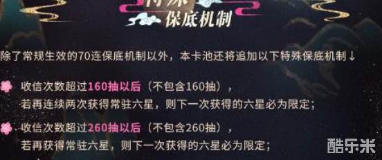 不过小伙伴们可以放心的是是有保底机制的,一般大家70连就能保底,此外特殊保底机制是大家超过160抽之后连续再抽两次的话,就能获得常驻六星,并且下一次六星必定为限定。当小伙伴们抽取超过260以后,也是会得到限定六星,超过360次也是如此。