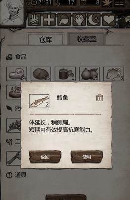 2.冬天怎么过:从31-61天都属于冬天,尤其在50-55天左右温度非常低,最好在探索完前期的几个资源点以后,就开始累积资源。将火堆和帐篷升满级,准备大量的草药,淡水和木头就能过,如果有抗寒的鱼或者藤甲就更轻松了。