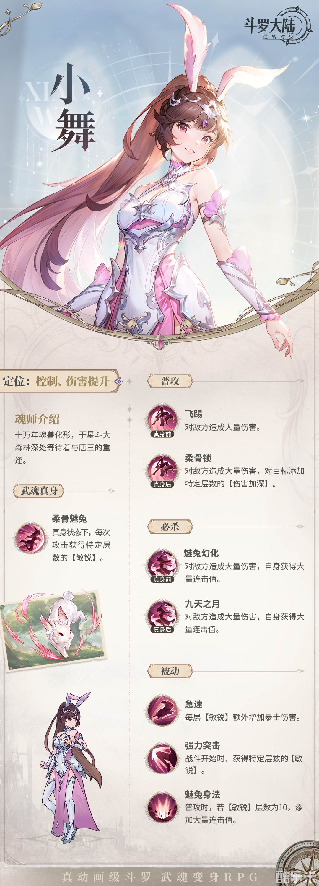 本篇酷乐米小编给大家带来了《斗罗大陆:逆转时空》小舞角色技能图鉴!小舞是十万年魂兽柔骨兔重修化形成人,初代史莱克七怪之一,年龄排行第五,外号"柔骨魅兔"。在《斗罗大陆:逆转时空》里,小舞的定位是控制和伤害提升,开启武魂真身后,可以极大提升对敌方造成的额外伤害。一系列连击打得敌人猝不及防,太飒啦小舞姐!