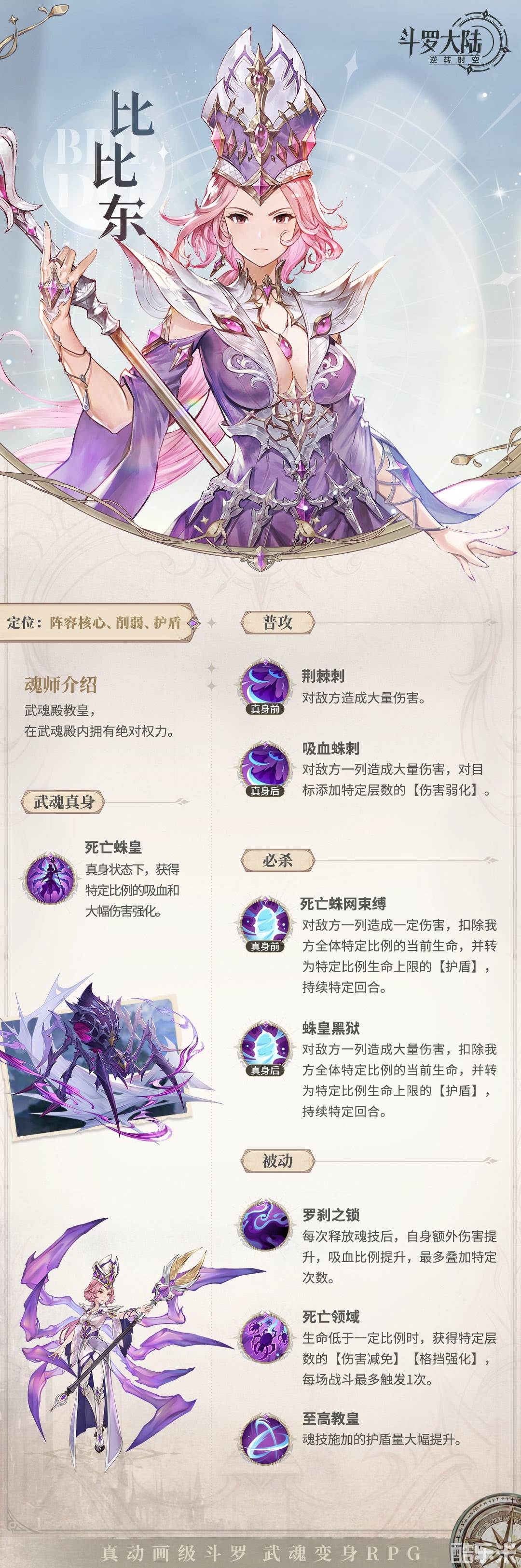 本次酷乐米小编给大家带来了《斗罗大陆:逆转时空》比比东角色技能图鉴,比比东,武魂殿末代教皇,武魂帝国开国女皇兼末代皇帝,一级神祇·罗刹神,斗罗大陆两万年来第三位成神者,杀戮之都十位杀神之一。游戏中比比东的定位是阵容核心,削弱,护盾,开启武魂真身后,会获得特定比例的吸血和大幅伤害强化。