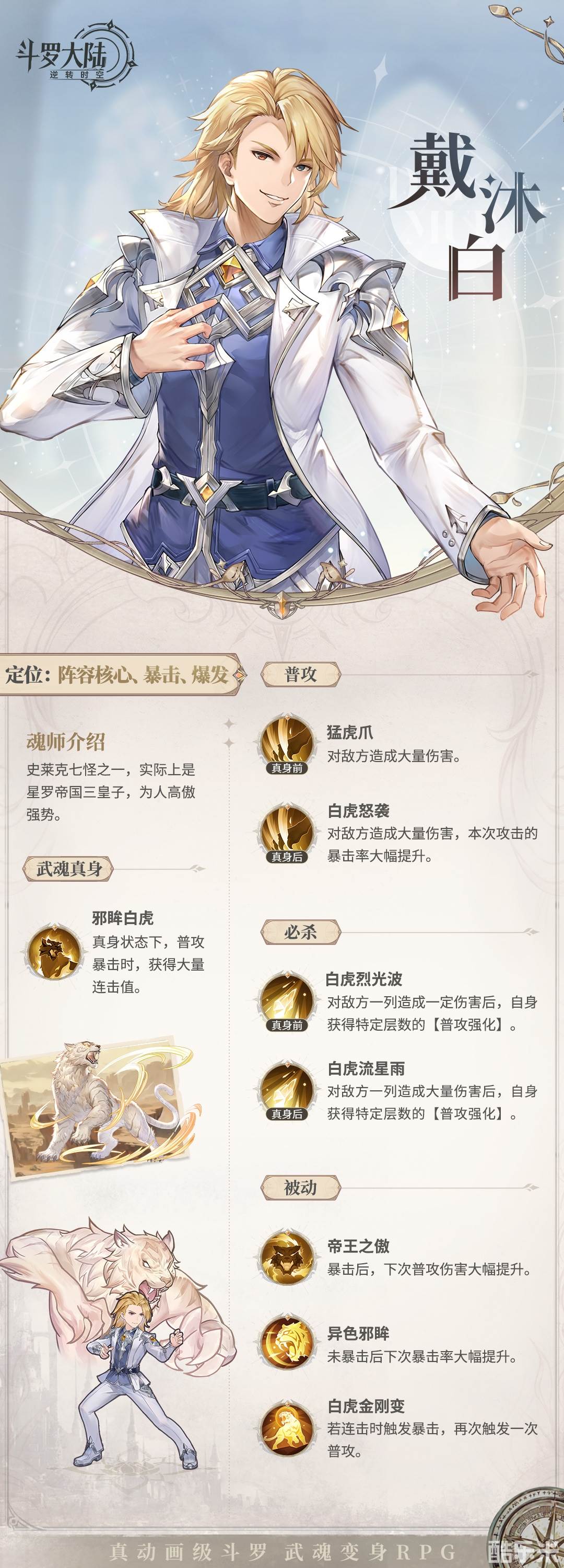 戴沐白不仅是星罗帝国三皇子还是初代史莱克七怪的一员,年龄是里面最大的武魂是邪眸白虎,他的普通攻击叫做猛虎爪,能扑向敌人对其造成大量伤害,他的必杀技叫做白虎烈光波,能对敌方一排的敌人造成伤害,同时还能获得一定层数的强化普攻。